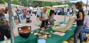 De Oertijdmarkt die op zondag 4 augustus bij het Hunebedcentrum werd georganiseerd, was een boeiend en succesvol. De stand van onze vereniging werd goed bezocht. Er was veel belangstelling van jong en oud voor het maken van sierraden uit de tijd van Vikingen en uit prehistorie. Kinderen konden met de metaaldetector op zoek naar “schatten”. Bezoekers hebben informatie meegekregen over de onderwerpen die werden getoond. Zo werd de nieuwe leskoffer “Muziek in de prehistorie” voor het basisonderwijs voor het eerst gepresenteerd. Meer dan 60 bezoekers deden mee aan het raden van het gewicht van de in Groningen gevonden kanonskogel. Drie bezoekers zaten 20 gram vanaf het werkelijke gewicht.