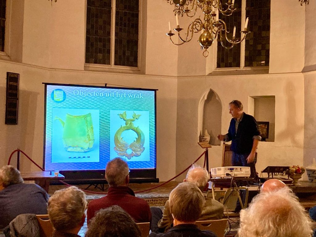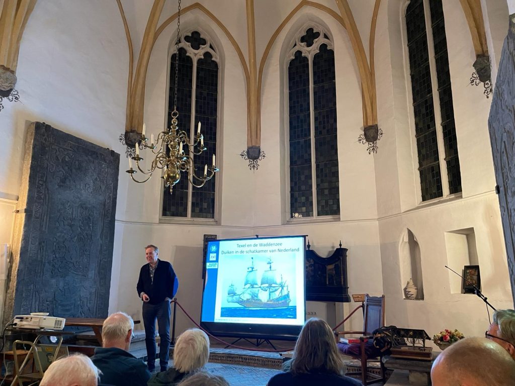 Op woensdag 21 februari hield Michiel Bartels, in een goed gevulde Dekenkapel van de Pieterskerk, een mooi en interessante verhaal over de verschillende scheepswrak ontdekkingen rond Texel. Michiel is gemeente Archeoloog van Hoorn en Texel en kan dus voor zijn presentatie uit zijn ruime ervaring putten.